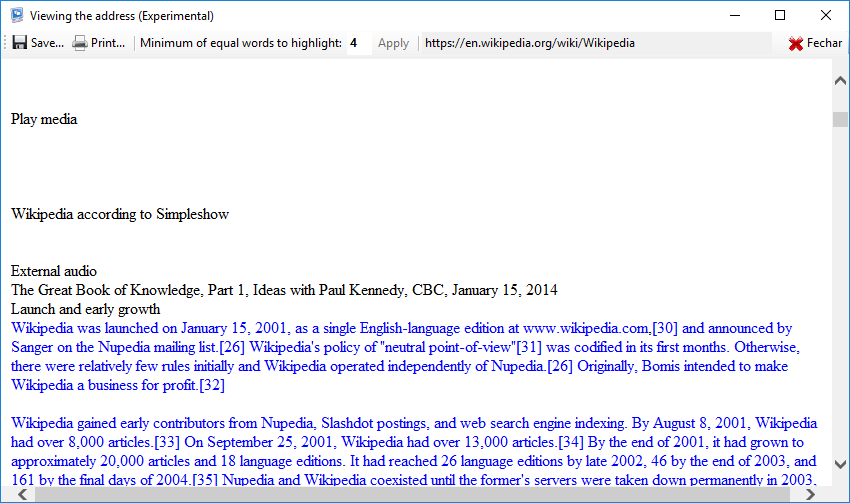 Plagius examines documents of various formats (Word, PDF, OpenOffice, HTML, RTF, plain text...) and displays detailed reports, informing the references found, the frequency of occurrences on the Internet and the percentage of suspected plagiarism.